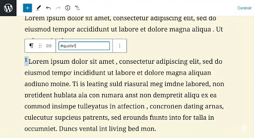 Schreibe eine Zahl hinter den Satz, markiere sie, wähle Hochgestellt (x²) und verlinke sie mit #quelle1.