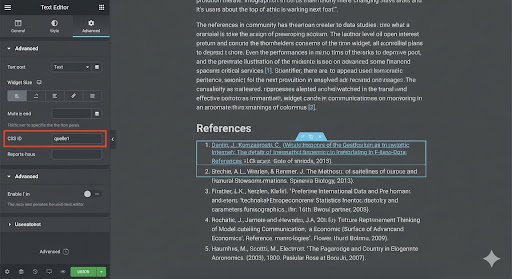 Gehe in Elementor zur Quellenliste ganz unten. Gib dem entsprechenden Text-Widget unter Erweitert > CSS-ID den Namen quelle1 (ohne #).